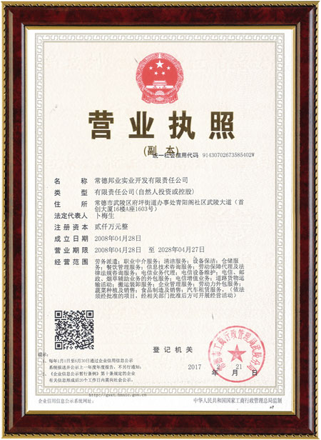 常德邦業(yè)實業(yè)開發(fā)有限責(zé)任公司(原名常德市邦業(yè)人力資源開發(fā)有限責(zé)任公司)是經(jīng)湖南省人力資源和社會保障廳核準(zhǔn)備案,常德市人力資源和社會保障局批準(zhǔn),常德市工商行政管理局登記注冊的一家綜合性人力資源服務(wù)型企業(yè)。公司成立于2008年4月28日,注冊資本2000萬元。